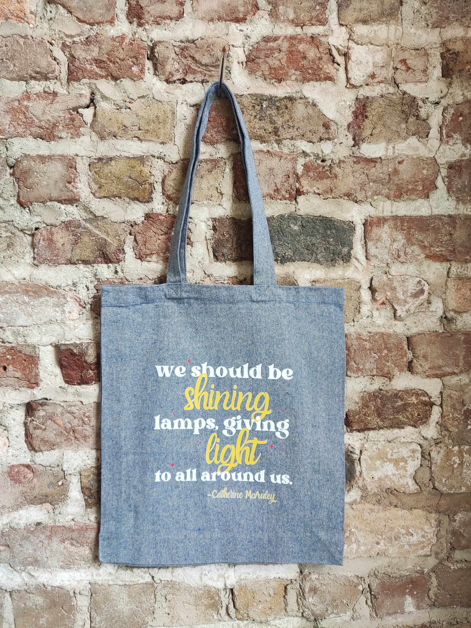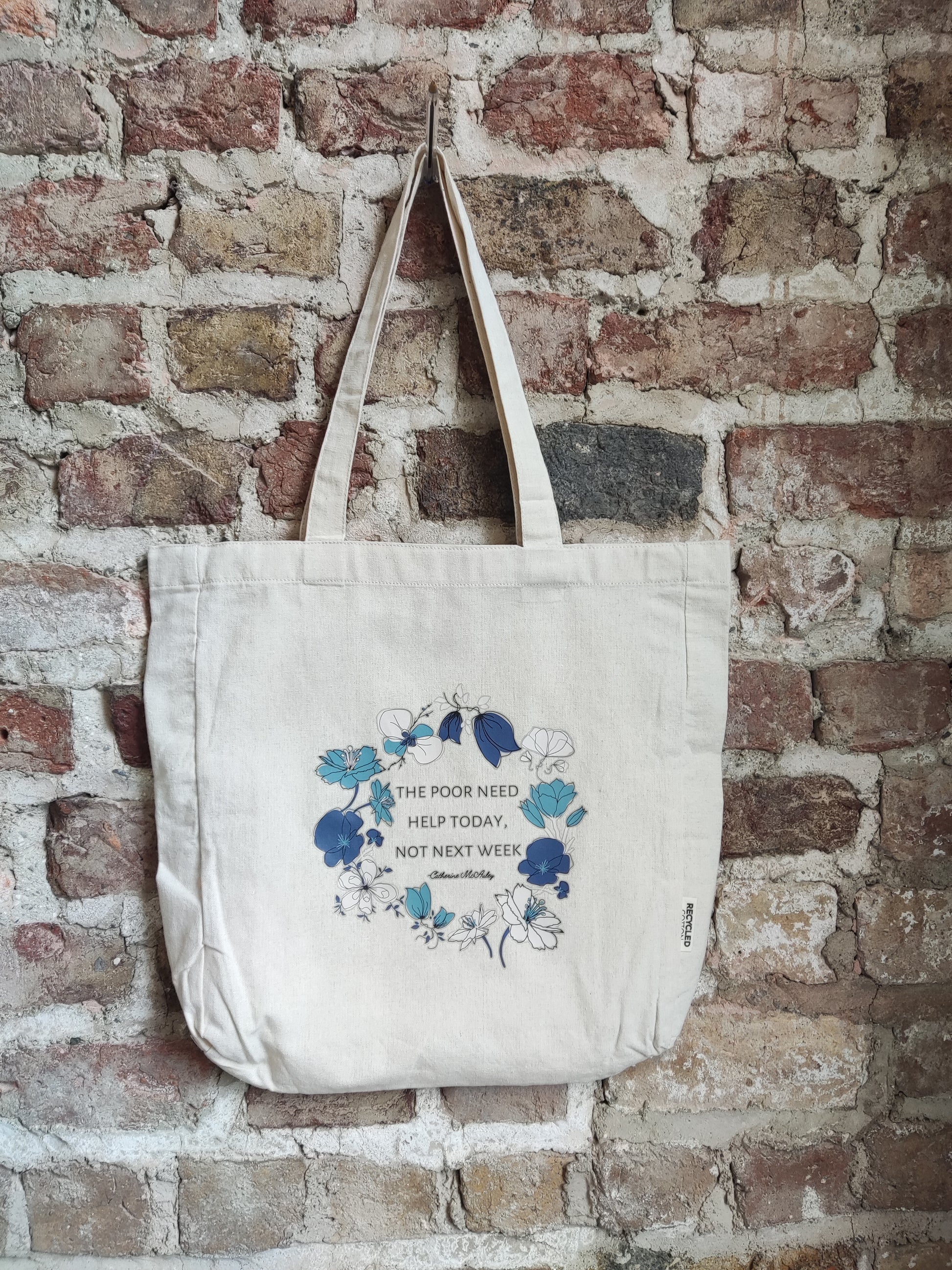 This blue or white bag features writing on one side and comes with two handles for easy carrying over the shoulder.